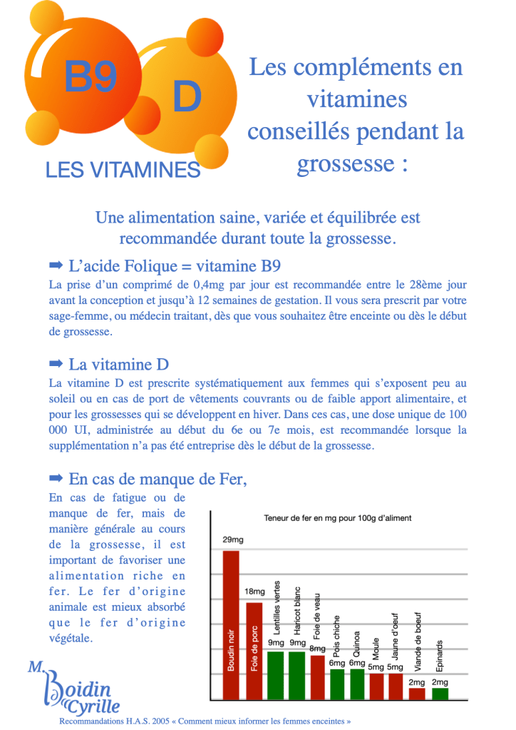 - La vitamine D est prescrite systématiquement aux femmes qui s’exposent peu au soleil ou en cas de port de vêtements couvrants ou de faible apport alimentaire, et pour les grossesses qui se développent en hiver. Dans ces cas, une dose unique de 100 000 UI, administrée au début du 6e ou 7e mois, est recommandée lorsque la supplémentation n’a pas été entreprise dès le début de la grossesse.